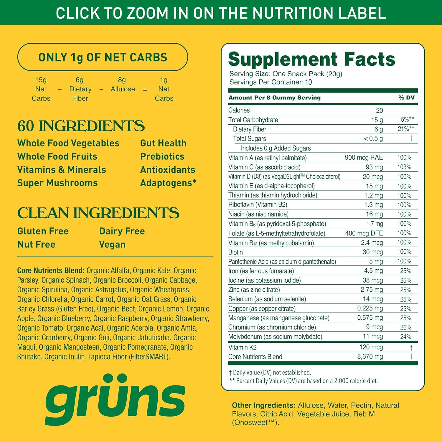 - NO CUTTING CORNERS: Grüns is plant-based and vegan. Our gummies are free from gluten, dairy, and nut free, with no artificial additives. Available in low-sugar and sugar-free options. Every pack is made with the finest whole-food ingredients and produced using the highest quality manufacturing practices.